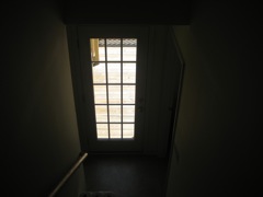 Looking down stairs at door to deck